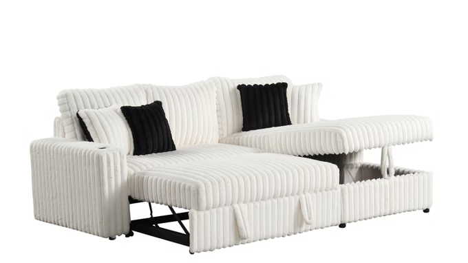 LINA 2 Pcs Pull Out Bed Sectional with cup holders, usb ports, and storage chaise. in a gorgeous corduroy fabric. colors available black and beige.